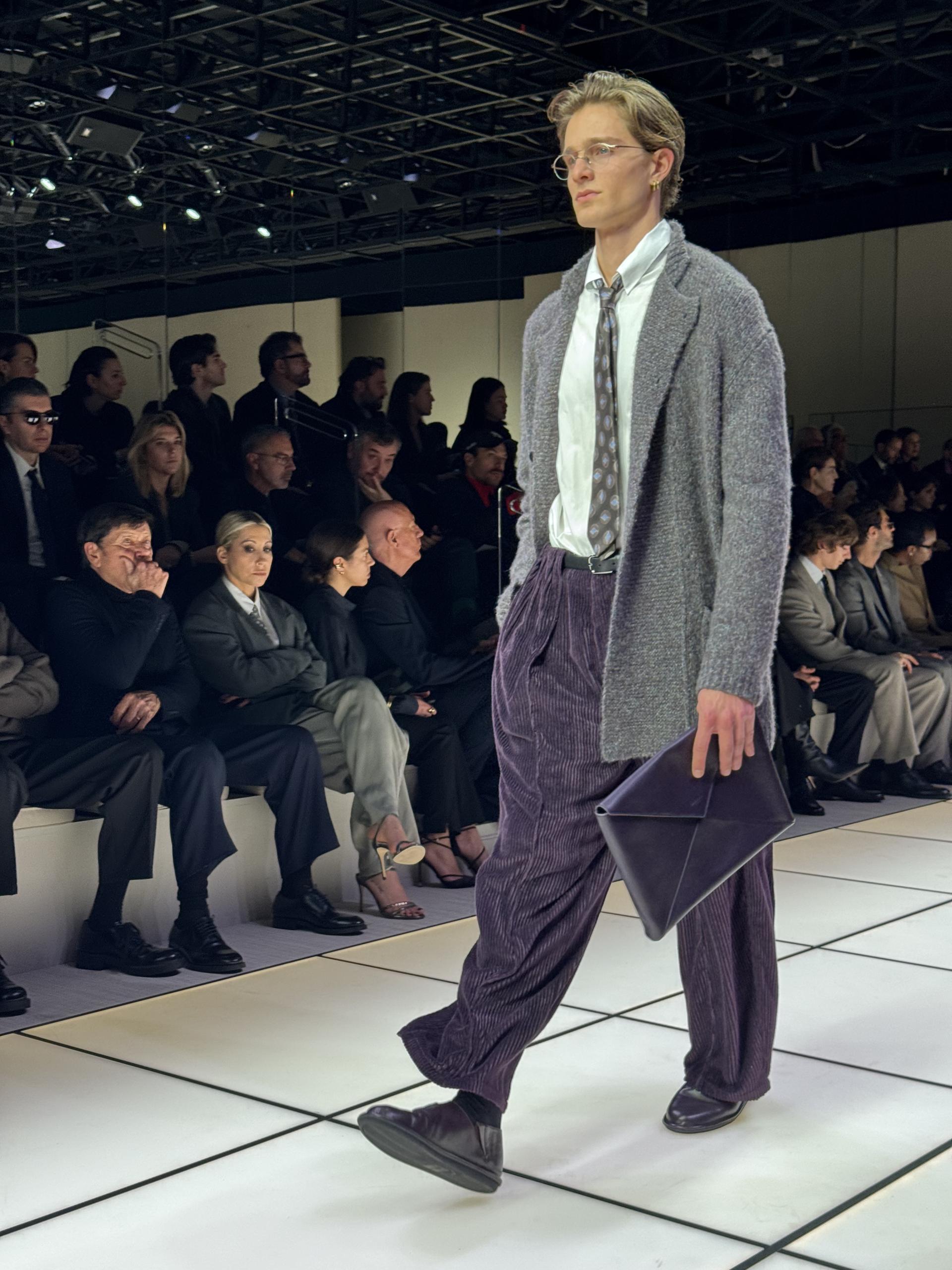 This time, however, that contemporizing force was softened—on a runway strewn with vintage carpets—by a nod to classic gentlemanly cloths that would not look out of place in a Savile Row tailoring shop like gun club checks, houndstooth tweeds, Glenn plaid, corduroy, and Donegal. Except in Sartori's hands they feel way more luxurious. These decidedly Anglo-Saxon cloths, once the mainstay of tony bespoke houses, were fused with Zegna's softened, flowing tailoring to create something new yet pleasingly familiar. Zegna was just the first indication that something was happening in Milan, something that suggests style that works across multiple age groups—with Sartori's teens to sixties cast of models to illustrate it—has new currency provided it's up there in quality. Forget quiet luxury, this is superluxury. |
